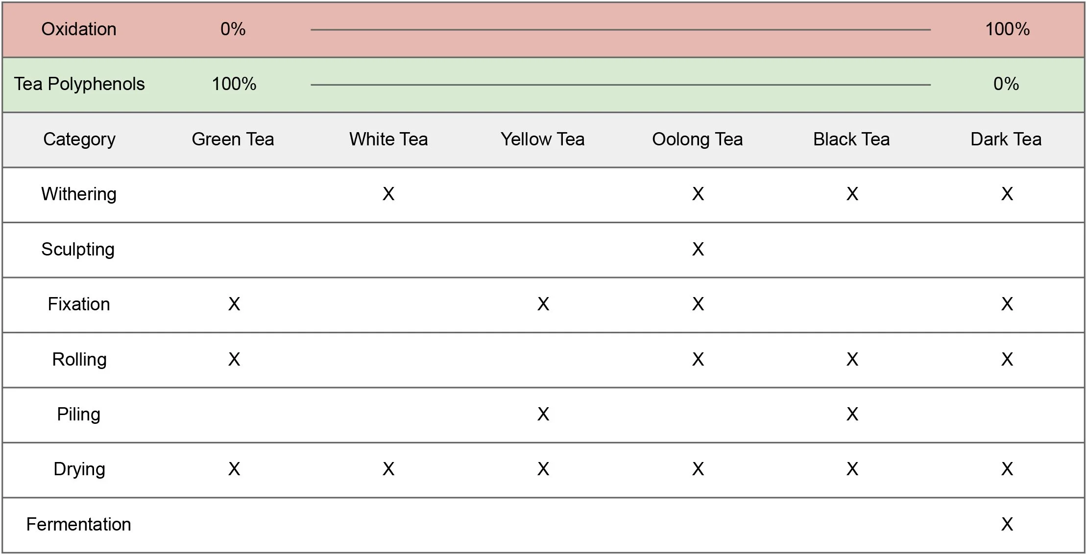 In tea, this transformation is driven by the oxidation of polyphenols—the compounds responsible for much of tea’s flavor and benefits. This can happen in two ways: one through natural enzymes (biochemical), and the other through exposure to heat, air, or time (chemical). How much these polyphenols are allowed to oxidize determines what type of tea you end up with.